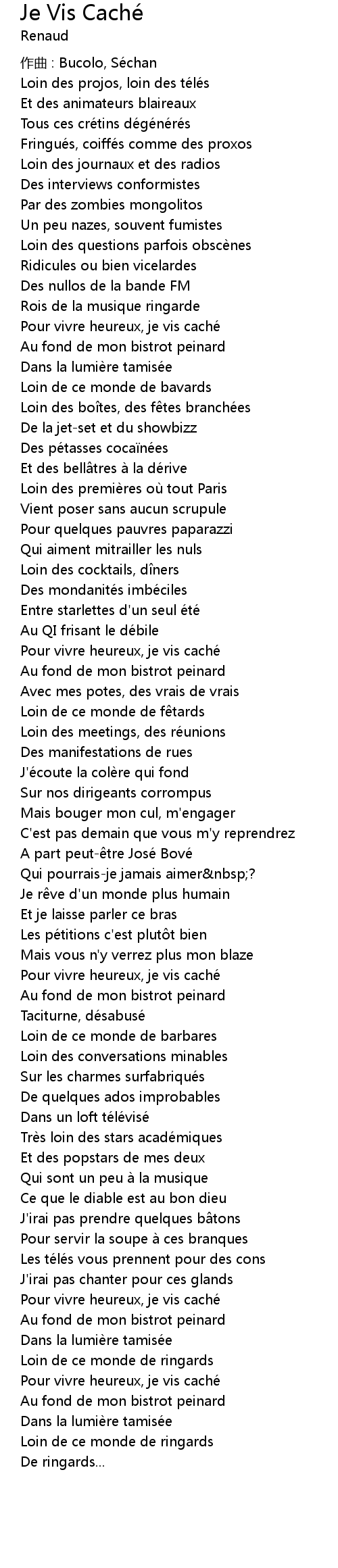 | Pour vivre heureux, je vis caché | |