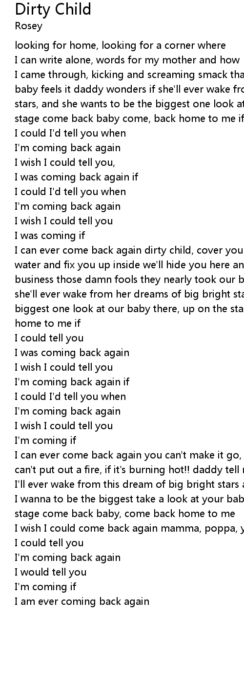 I can ever come back again dirty child, cover your black eyes we'll feed you water and fix you up inside we'll hide you here and get you out of that dirty business those damn fools they nearly took our baby from us daddy wonders if she'll ever wake from her dreams of big bright stars, and she wants to be the biggest one look at our baby there, up on the stage come back baby come, back home to me if |