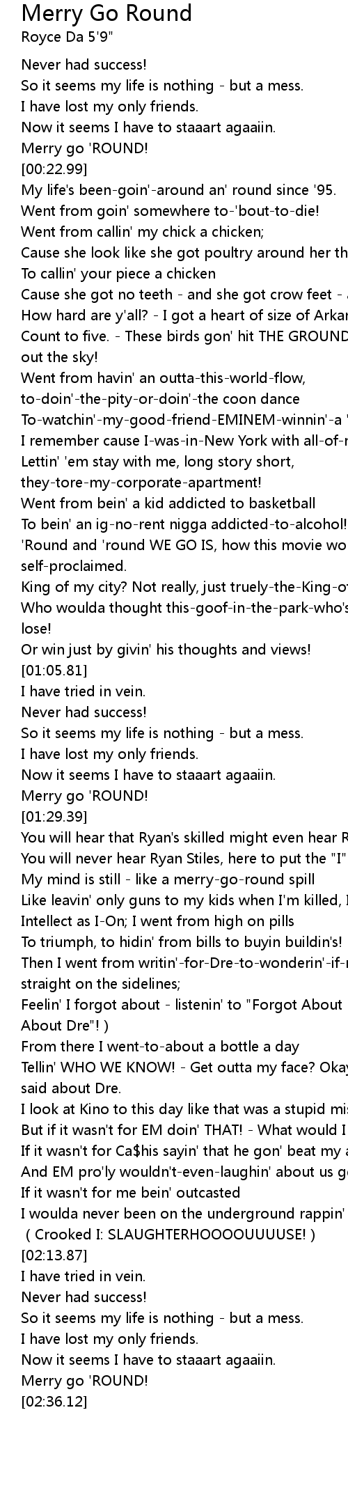 | [01:44.61] | Then I went from writin' forDretowonderin' ifmyheadwason straight on the sidelines |