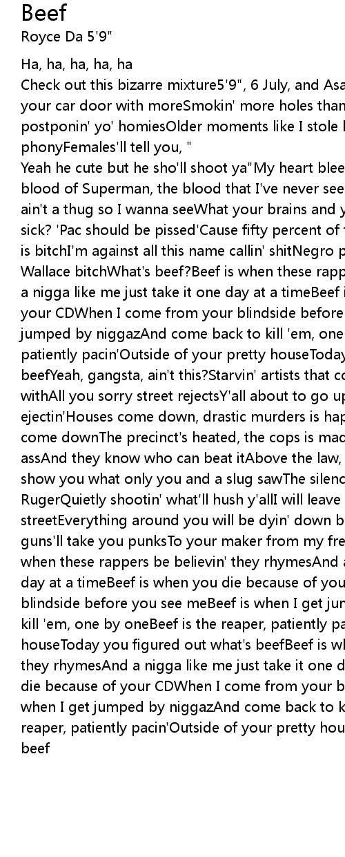 Yeah he cute but he sho'll shoot ya"My heart bleeds the blood of feloniesThe blood of Superman, the blood that I've never seenYou seem like the shook typeYou ain't a thug so I wanna seeWhat your brains and your blood look likeFuck is you sick? 'Pac should be pissed'Cause fifty percent of the niggaz suckin' his dick is bitchI'm against all this name callin' shitNegro please, listen to Chris Wallace bitchWhat's beef?Beef is when these rappers be believin' they rhymesAnd a nigga like me just take it one day at a timeBeef is when you die because of your CDWhen I come from your blindside before you see meBeef is when I get jumped by niggazAnd come back to kill 'em, one by oneBeef is the reaper, patiently pacin'Outside of your pretty houseToday you figured out what's beefYeah, gangsta, ain't this?Starvin' artists that comes with the guns he paint withAll you sorry street rejectsY'all about to go up in smoke, seats ejectin'Houses come down, drastic murders is happenin'Make a nigga momma mouth come downThe precinct's heated, the cops is madBecause they know who shot yo' assAnd they know who can beat itAbove the law, run up on y'allSo quickly and show you what only you and a slug sawThe silence is screwed in front of the .9 RugerQuietly shootin' what'll hush y'allI will leave you lyin' down in a streetEverything around you will be dyin' down but the beefPlease believe, my guns'll take you punksTo your maker from my freezin' sleeveWhat's beef?Beef is when these rappers be believin' they rhymesAnd a nigga like me just take it one day at a timeBeef is when you die because of your CDWhen I come from your blindside before you see meBeef is when I get jumped by niggazAnd come back to kill 'em, one by oneBeef is the reaper, patiently pacin'Outside of your pretty houseToday you figured out what's beefBeef is when these rappers be believin' they rhymesAnd a nigga like me just take it one day at a timeBeef is when you die because of your CDWhen I come from your blindside before you see meBeef is when I get jumped by niggazAnd come back to kill 'em, one by oneBeef is the reaper, patiently pacin'Outside of your pretty houseToday you figured out what's beef