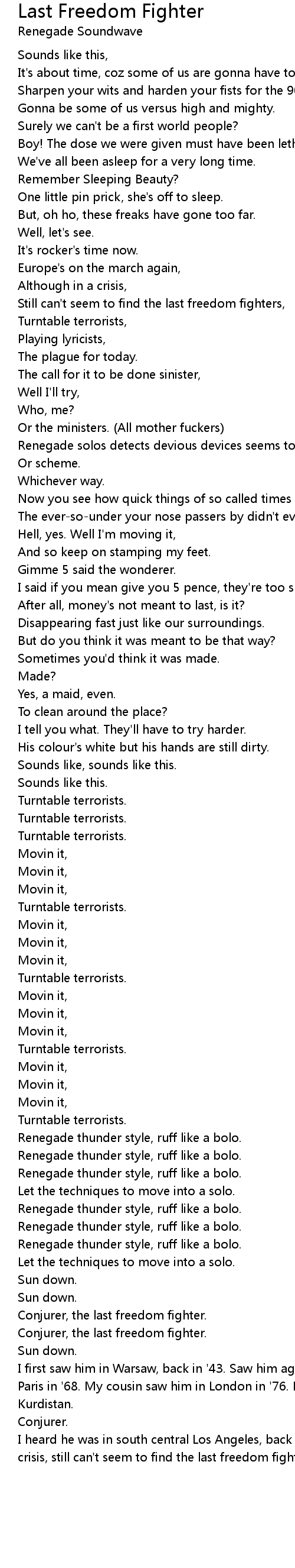 I heard he was in south central Los Angeles, back in '92. That in times of crisis, still can't seem to find the last freedom fighters.