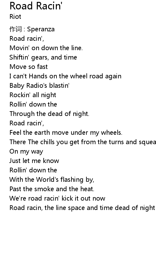 | Road racin, the line space and time dead of night we' re road racin' |