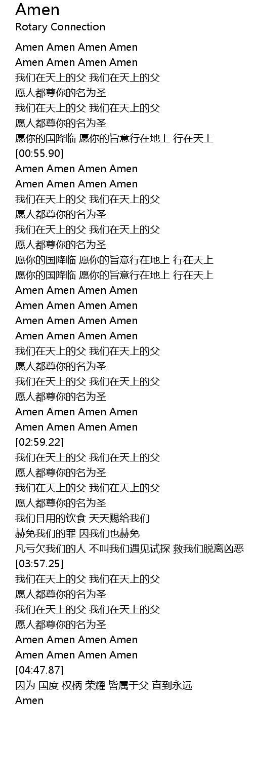 | [01:04.03] | Amen Amen Amen Amen |