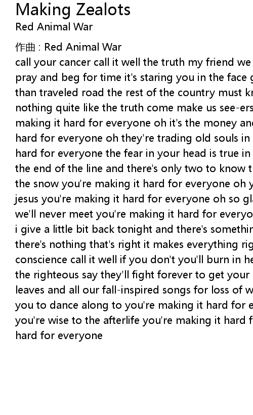 | call your cancer call it well the truth my friend we know you' re scared do you pray and beg for time it' s staring you in the face goodnight i chose the less than traveled road the rest of the country must know something yeah there' s nothing quite like the truth come make us seeers and believers in you you' re making it hard for everyone oh it' s the money and the church you' re making it hard for everyone oh they' re trading old souls in for new ones you' re making it hard for everyone the fear in your head is true in time a doctor' s note this is the end of the line and there' s only two to know through the fields and through the snow you' re making it hard for everyone oh you bet on boxing he' ll bet on jesus you' re making it hard for everyone oh so glad to know we' ll die for gods we' ll never meet you' re making it hard for everyone i get a little bit of reason i give a little bit back tonight and there' s something with this season yeah there' s nothing that' s right it makes everything right tonight calm your conscience call it well if you don' t you' ll burn in hell at least that' s what the righteous say they' ll fight forever to get your soul jump in these dead leaves and all our fallinspired songs for loss of words we' ll make music for you to dance along to you' re making it hard for everyone oh as you' re claiming you' re wise to the afterlife you' re making it hard for everyone you' re making it hard for everyone |
