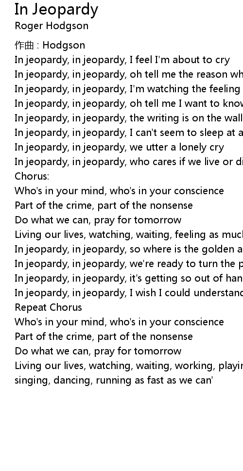 | In jeopardy, in jeopardy, I feel I' m about to cry | |