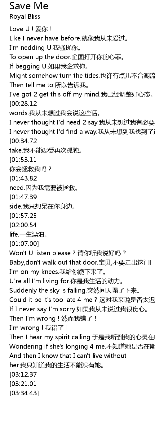 | [02:54.04][01:53.11][00:53.76][02:41.22][01:40.52][00:41.08] | Won't U save me ? 你会拯救我吗? |