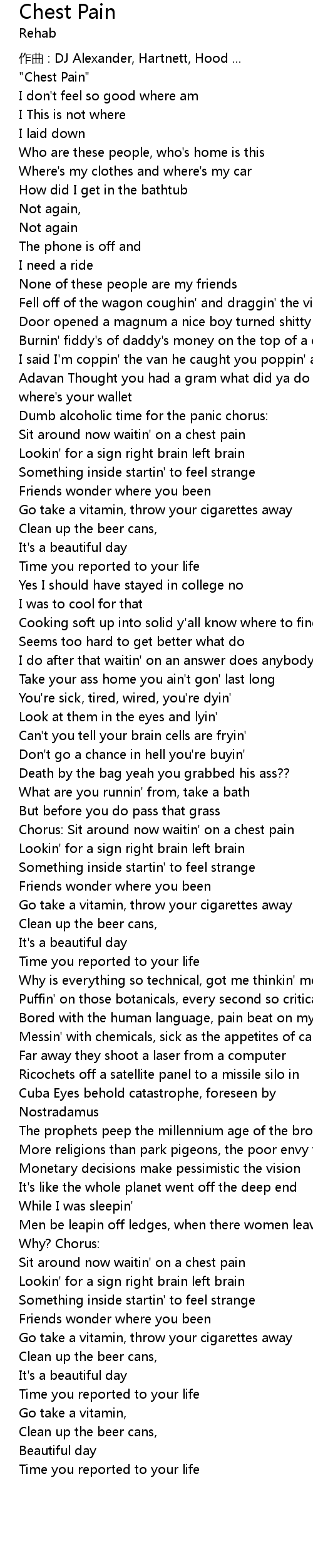 | Chorus: Sit around now waitin' on a chest pain | |