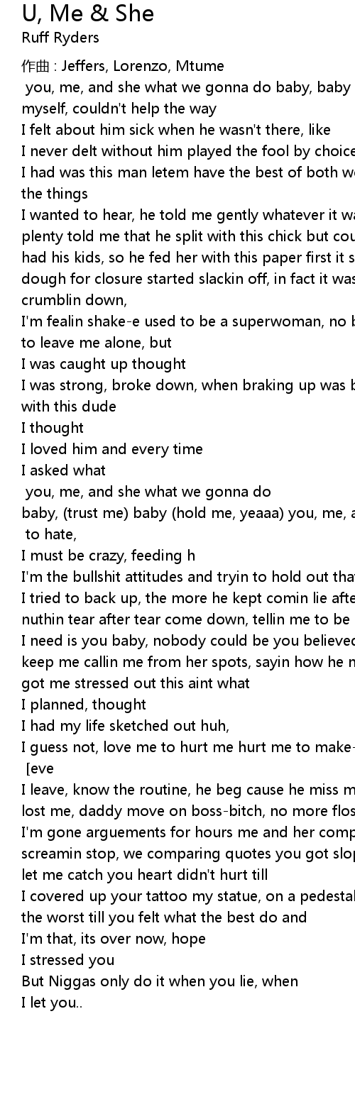 | I should do, he said trust him chorus 2 you, me, and she what we gonna do baby, trust me baby hold me, yeaaa you, me, and she what we gonna do baby believe me, baby need me, yeaaa eve to hate, | |