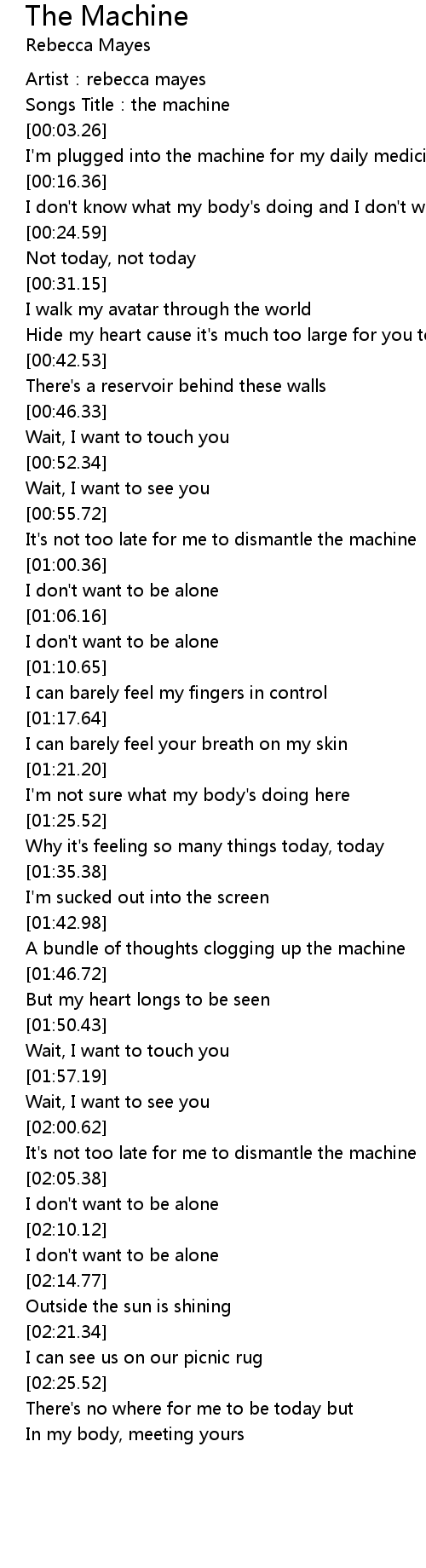 | [02:02.13] | It's not too late for me to dismantle the machine |