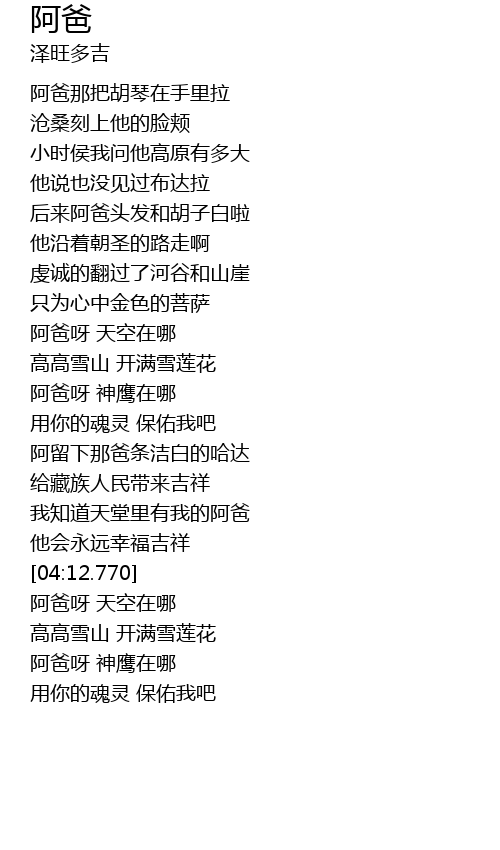 | [02:54.090] | 阿留下那爸条洁白的哈达 |