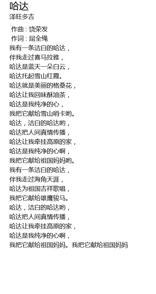 | [01:37.48] | 哈达,洁白的哈达哟, |