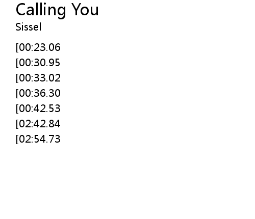 | [03:06.64][02:54.73][02:19.46][00:58.51] | I am calling you... |