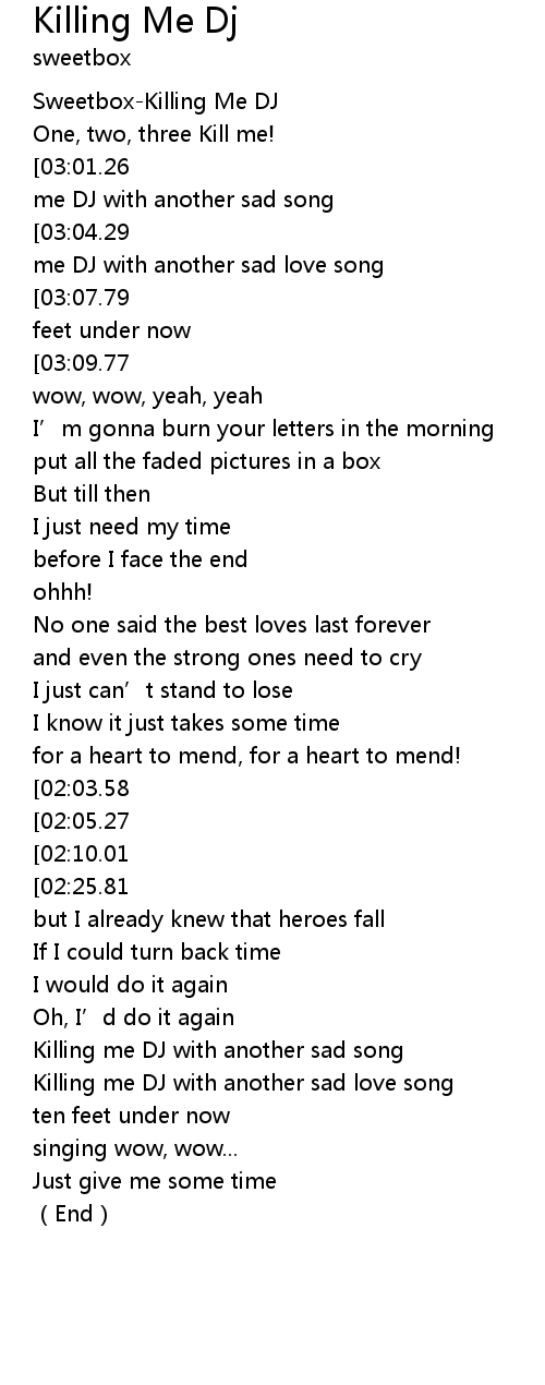| [03:12.89][03:01.26][02:50.12][01:51.41][01:40.01][01:01.86][00:50.00][00:15.19][00:03.93] | Killing me DJ with another sad song |