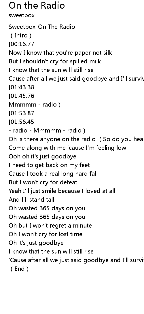 | [02:56.29][01:56.45][00:56.77] | Come along with me ' cause I' m feeling low Mmmmm radio Mmmmm radio |