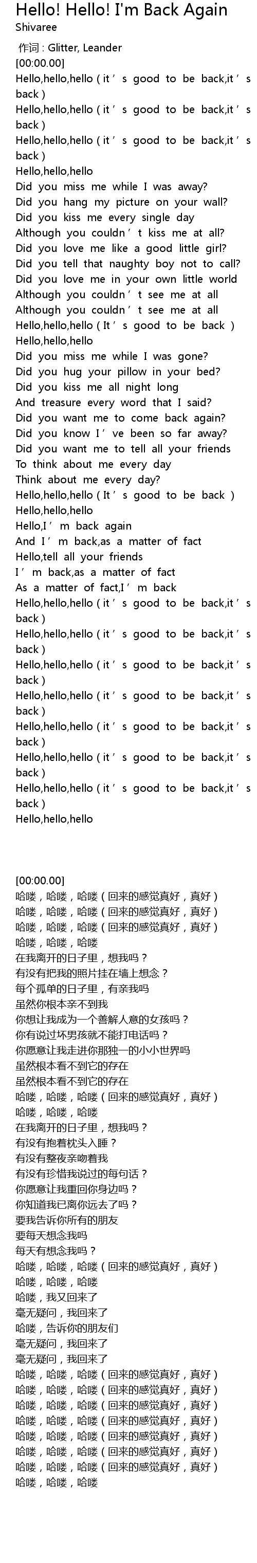 | [02:16.37] | Hello,hello,hello(it ’s good to be back,it ’s good to be back) |