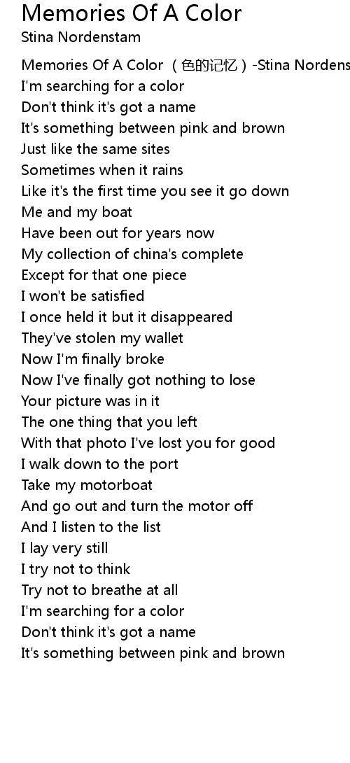| [00:00.00] | Memories Of A Color (色的记忆)-Stina Nordenstam |