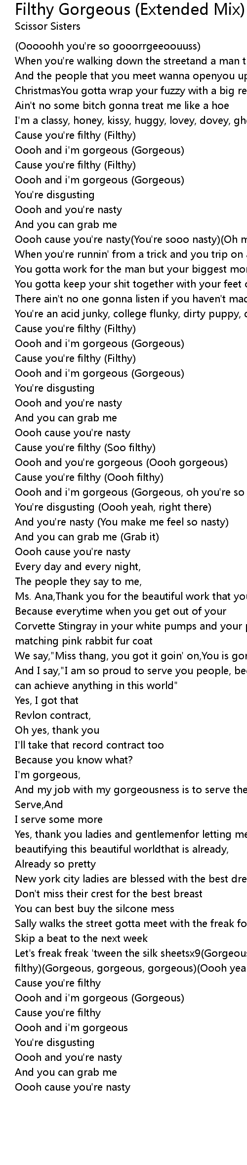 Let's freak freak 'tween the silk sheetsx9(Gorgeous)(Oooh gorgeous)(Oooh filthy, filthy)(Gorgeous, gorgeous, gorgeous)(Oooh yeah, right there)(Gorgeous) |