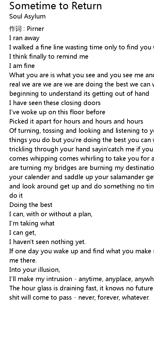 | Of turning, tossing and looking and listening to you and all the fucked up things you do but you' re doing the best you can with every grain of sand its trickling through your hand sayin' catch me if you can if someday comes early comes whipping comes whirling to take you for all you have learned the tables are turning my bridges are burning my destination sometime to return throw away your calender and saddle up your salamander get up and get down ride in to town and look around get up and do something no time to choose it do it do it do it do it | |
