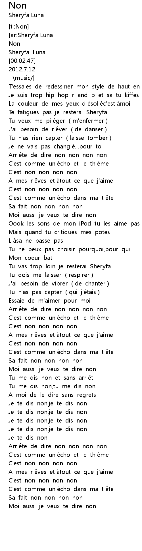 | [01:23.94] | Tu vas trop loin je resterai Sheryfa |