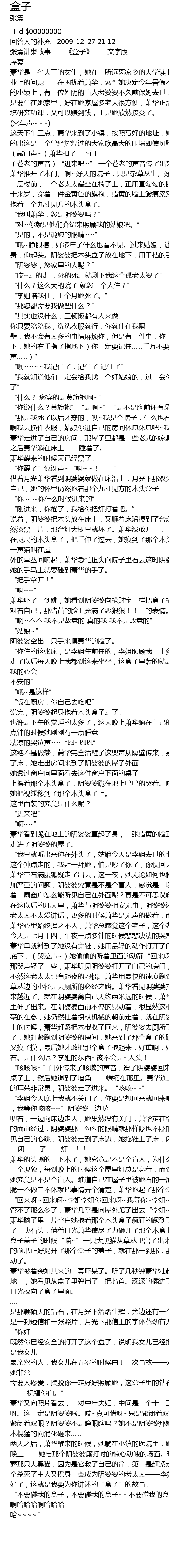 | [00:02.867] | 回答人的补充 2009-12-27 21:12 张震讲鬼故事——《盒子》——文字版 |