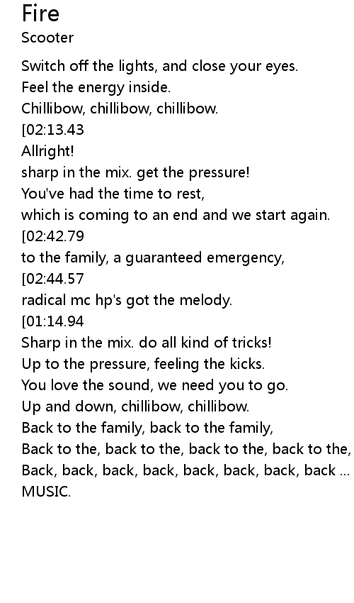 | [02:56.37][02:13.43][01:15.93][00:32.55][00:18.65] | Fire!!! |