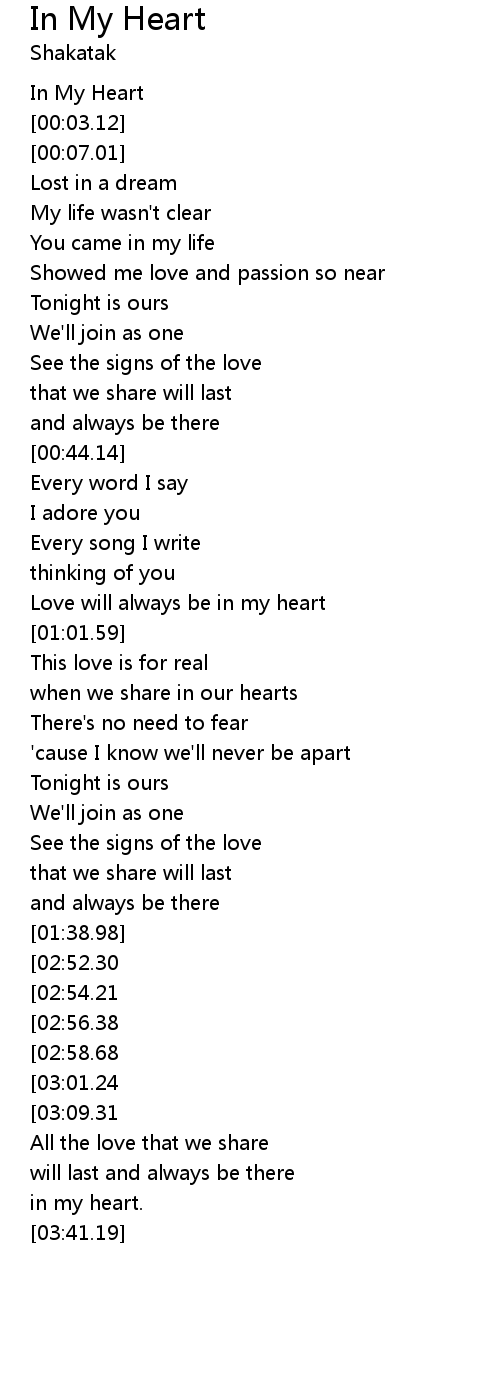 | [03:20.52][03:01.24][02:06.18][01:48.90] | Love will always be in my heart |