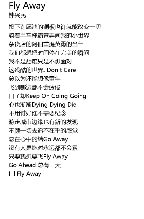 | [02:57.474] | zhǐ yào wǒ xiǎng yào fēi Fly Away |