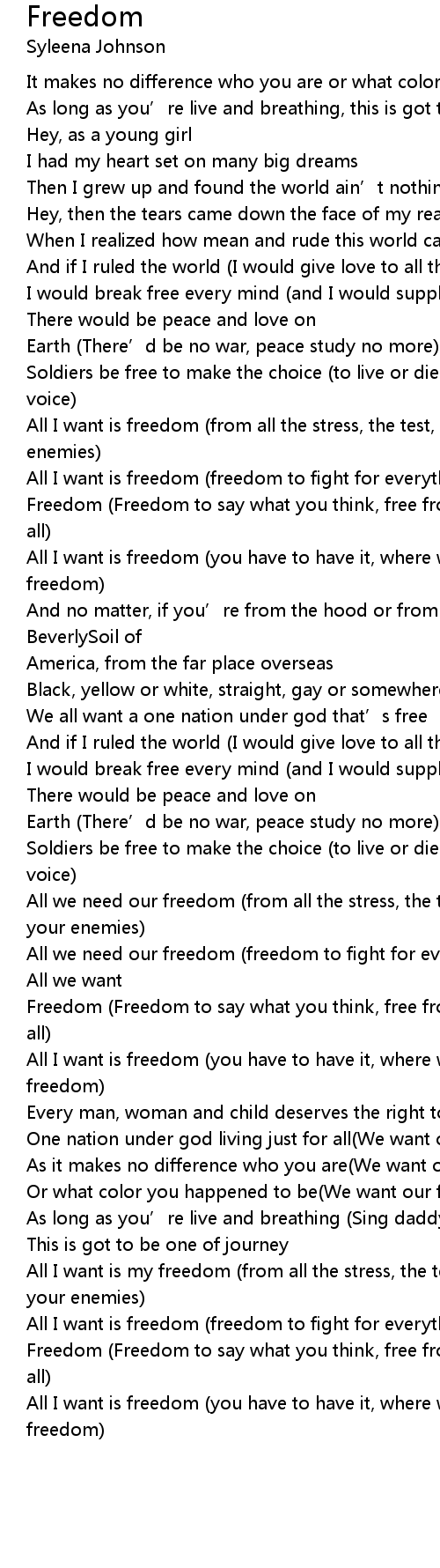 | All I want is my freedom from all the stress, the test, the mess, the lies of your enemies | |
