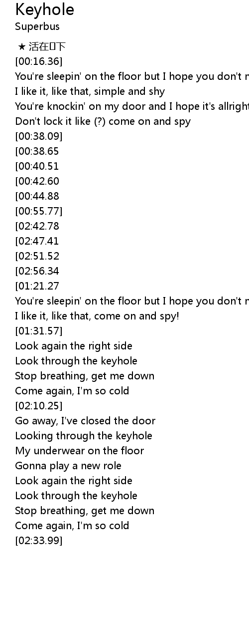 | [00:49.30][00:40.51] | Looking through the keyhole |