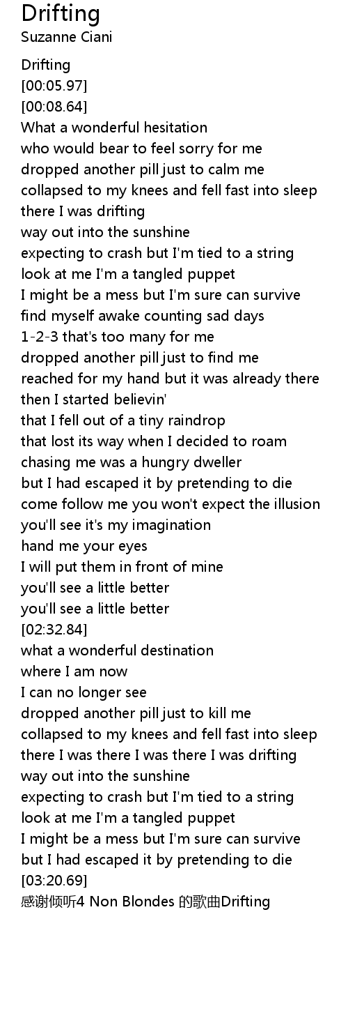 | [03:21.69] | 感谢倾听4 Non Blondes 的歌曲Drifting |