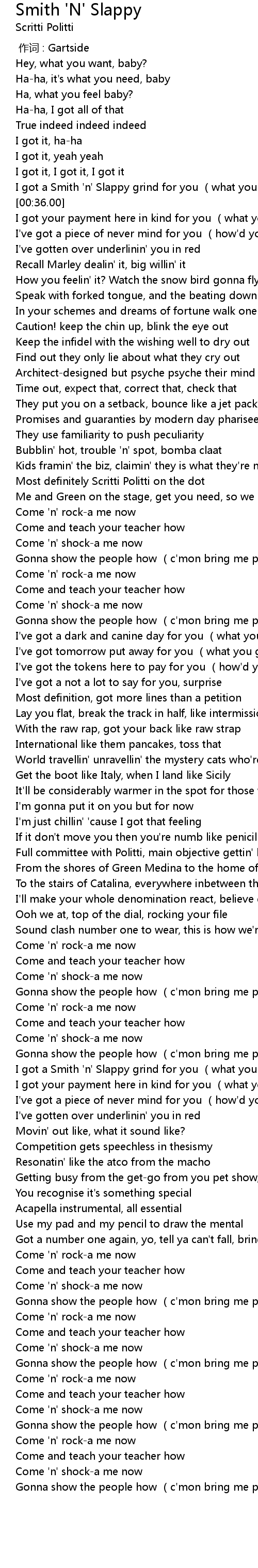 | [03:23.01] | I got a Smith 'n' Slappy grind for you (what you got now?) |