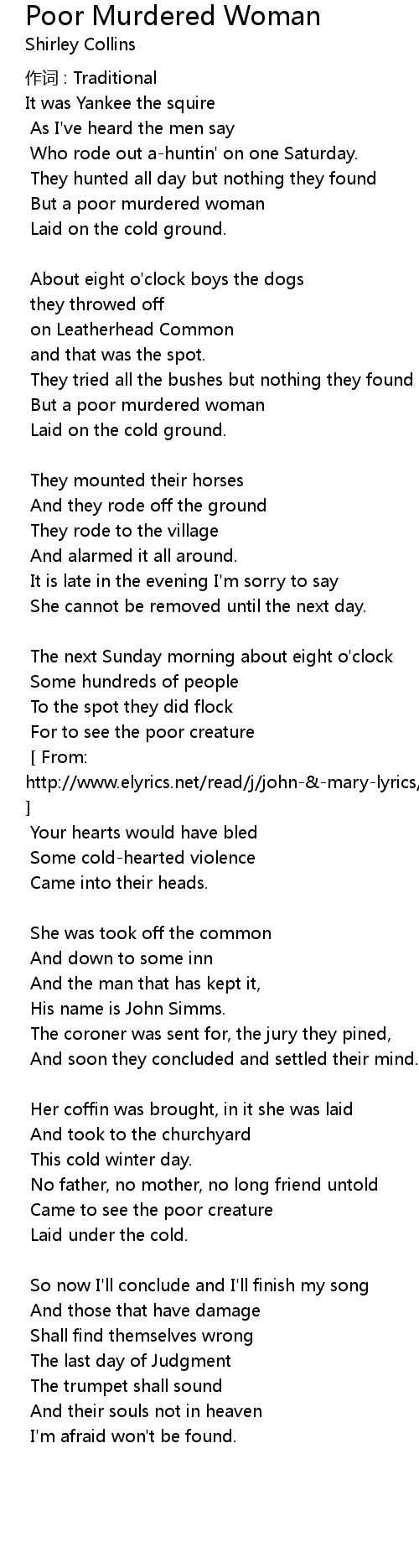 | From: http: www. elyrics. net read j john marylyrics thepoormurderedwomanlyrics. html | |