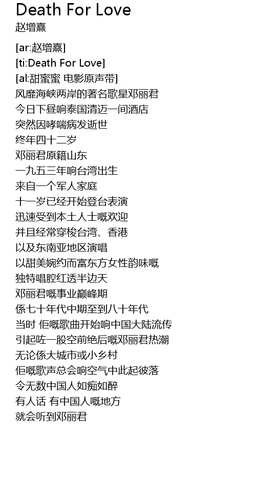 | [00:00.87] | 风靡海峡两岸的著名歌星邓丽君 |