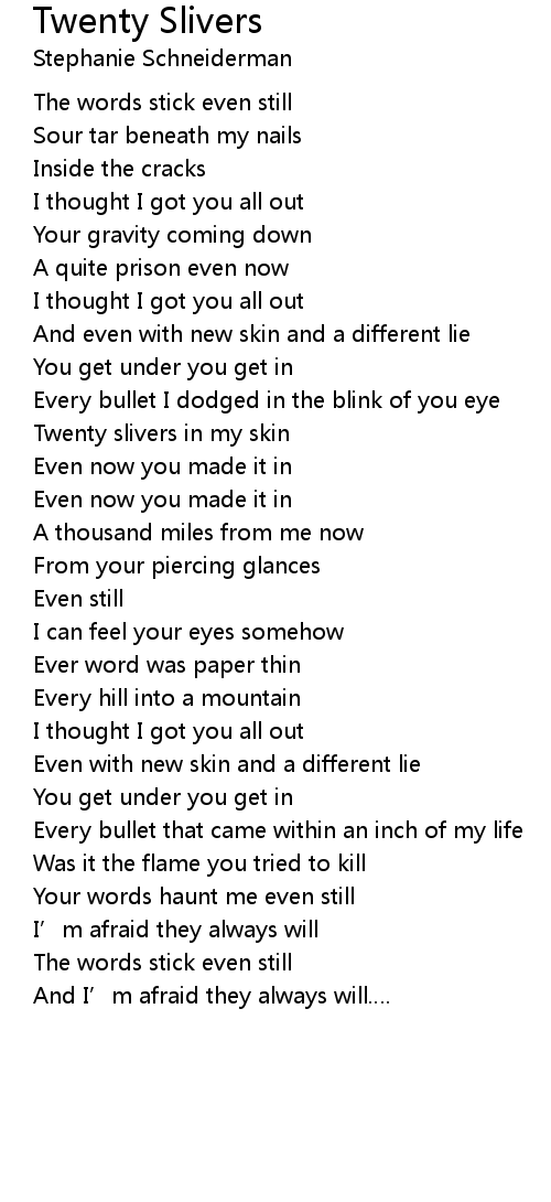 | Twenty slivers in my skin | |