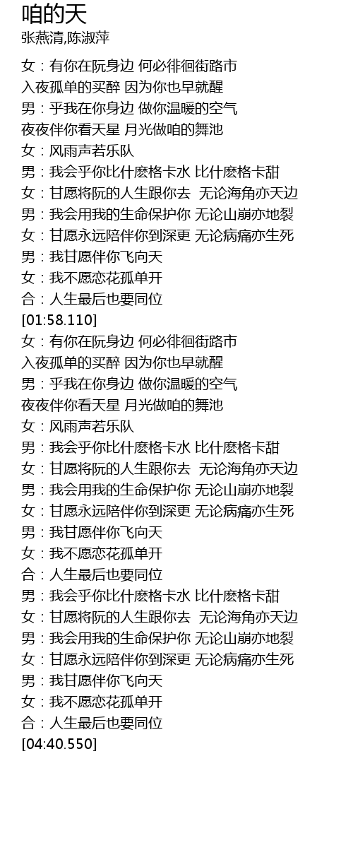 | [04:24.830] | 男:我甘愿伴你飞向天 |