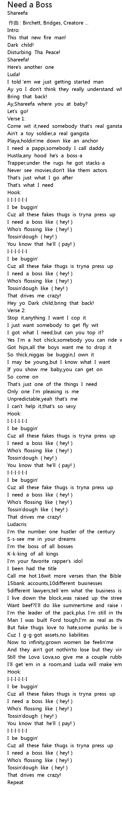 | [02:00.250] | I need a boss like (hey!) |