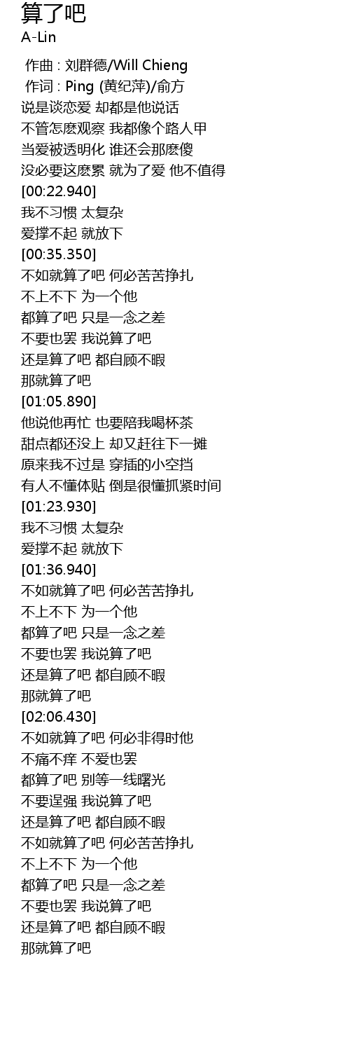 | [01:50.080] | bu yao ye ba wo shuo suan le ba |