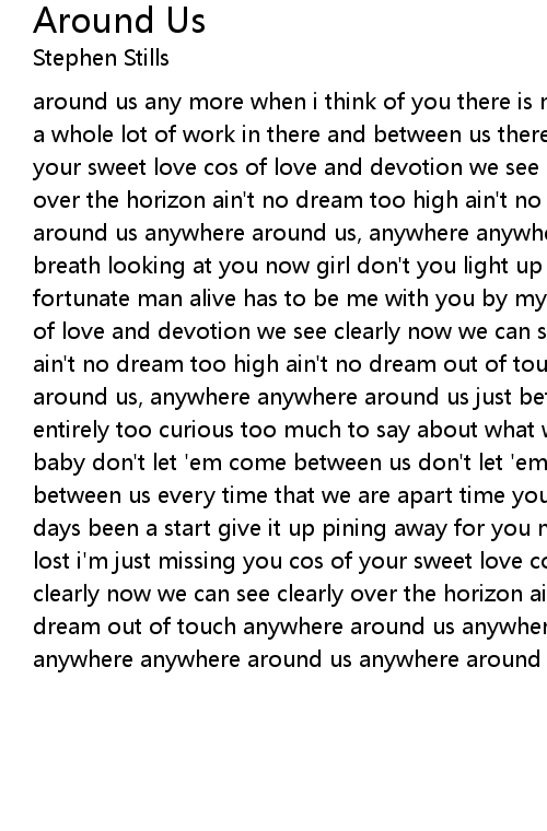 around us any more when i think of you there is no separating me and you we got a whole lot of work in there and between us there's one heart beating cos of your sweet love cos of love and devotion we see clearly now we can see clearly over the horizon ain't no dream too high ain't no dream out of touch anywhere around us anywhere around us, anywhere anywhere around us, anywhere takes my breath looking at you now girl don't you light up a room anyhow the most fortunate man alive has to be me with you by my side cos of your sweet love cos of love and devotion we see clearly now we can see clearly over the horizon ain't no dream too high ain't no dream out of touch anywhere around us anywhere around us, anywhere anywhere around us just between us people keep telling us entirely too curious too much to say about what we are doing prob'ly jealous baby don't let 'em come between us don't let 'em come between us baby come between us every time that we are apart time you're away more than a couple of days been a start give it up pining away for you missing your love girl i ain't lost i'm just missing you cos of your sweet love cos of love and devotion we see clearly now we can see clearly over the horizon ain't no dream too high ain't no dream out of touch anywhere around us anywhere around us anywhere around us, anywhere anywhere around us anywhere around us |