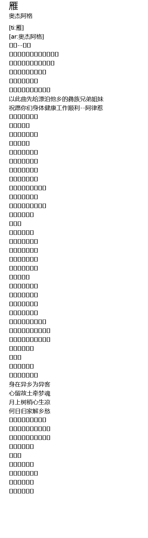 | [00:35.118] | 以此曲先给漂泊他乡的彝族兄弟姐妹 |