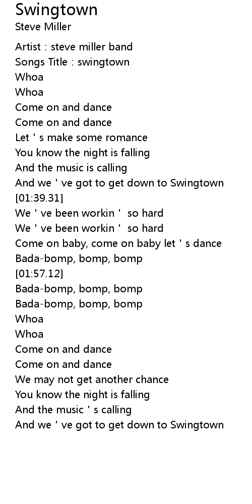 | [01:37.63] | And we ve got to get down to Swingtown |