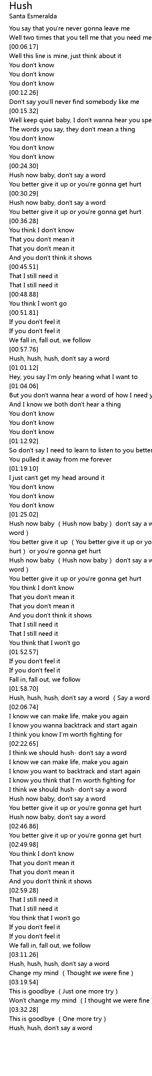 | [01:59.26] | Hush, hush, hush, don't say a word (Say a word x6) |