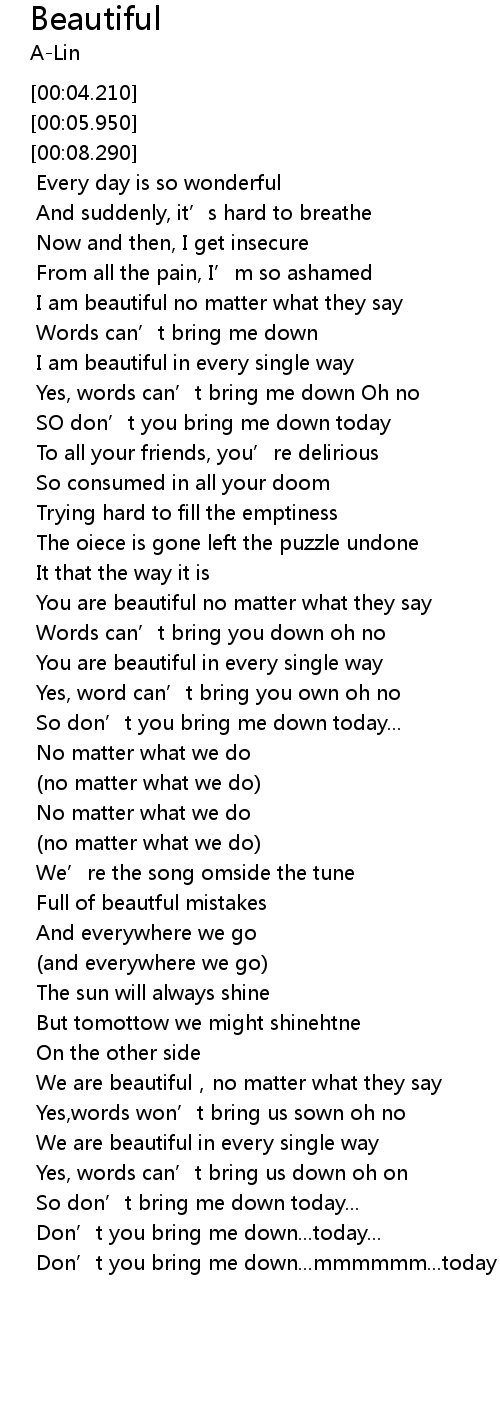 | [01:09.650] | Yes, words can' t bring me down Oh no |