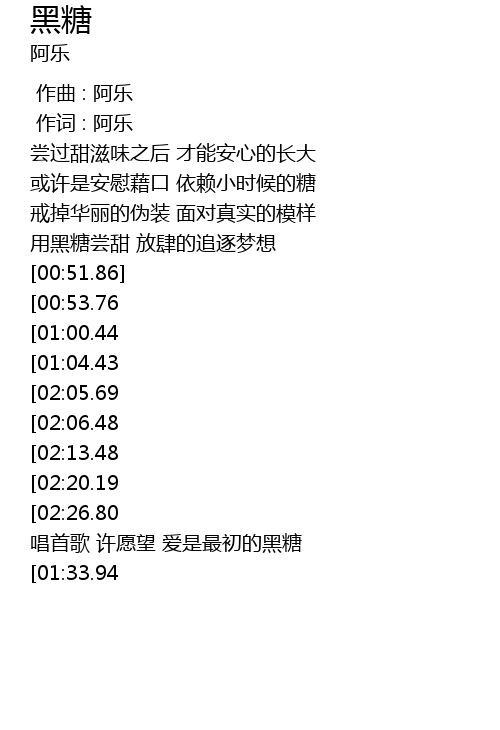 | [03:00.39] | 唱首歌 许愿望 爱是最初的黑糖 |