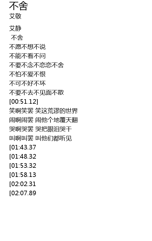 | [02:58.39][02:07.89] | bù yuàn bù xiǎng bù shuō bù shě |