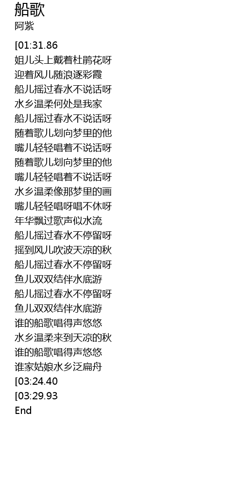 | [03:18.60] | 谁家姑娘水乡泛扁舟 |
