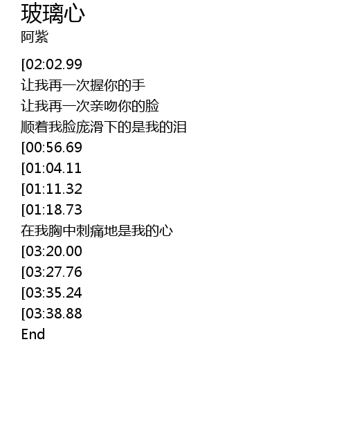 | [03:49.90][03:20.00][02:54.69][01:33.05] | 爱人的心是玻璃做的 |