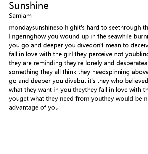 | mondaysunshineso highit's hard to seethrough the sunday clouds still lingeringhow you wound up in the seawhile burning insidespinning abovefurther you go and deeper you divedon't mean to deceivebut it's they who believethey fall in love with the girl they perceive not youblind them with kindnessuntil they are reminding they're lonely and desperateand you have a secretit's something they all think they needspinning above and burning insidefurther you go and deeper you divebut it's they who believedon't mean to deceivethey see what they want in you theythey fall in love with the girl they perceive not youget what they need from youthey would be nothing without youthey take advantage of you |