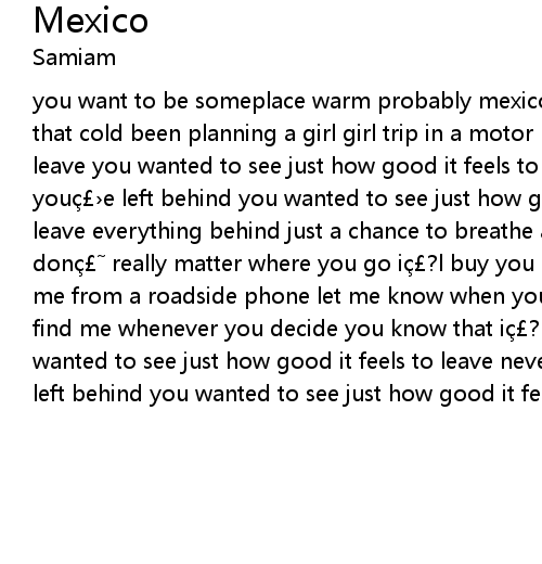 | you want to be someplace warm probably mexico even though it really not that cold been planning a girl girl trip in a motor home to see how it feels to leave you wanted to see just how good it feels to leave never mind the mess you e left behind you wanted to see just how good it feels to leave and leave everything behind just a chance to breathe a little time of your own it don really matter where you go i? l buy you some magazines you can call me from a roadside phone let me know when your coming home you know where to find me whenever you decide you know that i? l be here when you get home you wanted to see just how good it feels to leave never mind the mess you e left behind you wanted to see just how good it feels to leave |