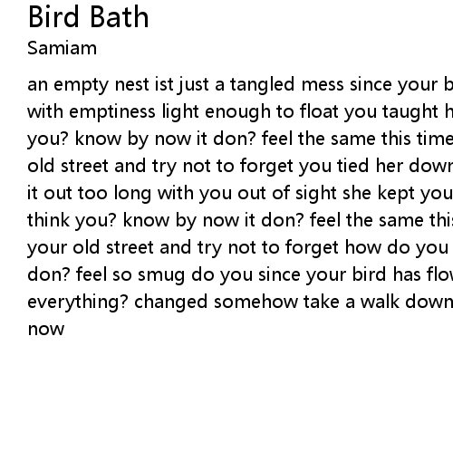 | an empty nest ist just a tangled mess since your bird has flown you filled her with emptiness light enough to float you taught her everything she knows think you? know by now it don? feel the same this time around take a walk down your old street and try not to forget you tied her down you left her alone she stuck it out too long with you out of sight she kept you in mind on her first flight think you? know by now it don? feel the same this time around take a walk down your old street and try not to forget how do you feel now you feel alone you don? feel so smug do you since your bird has flown think you? know by now everything? changed somehow take a walk down your old street think you? know by now |