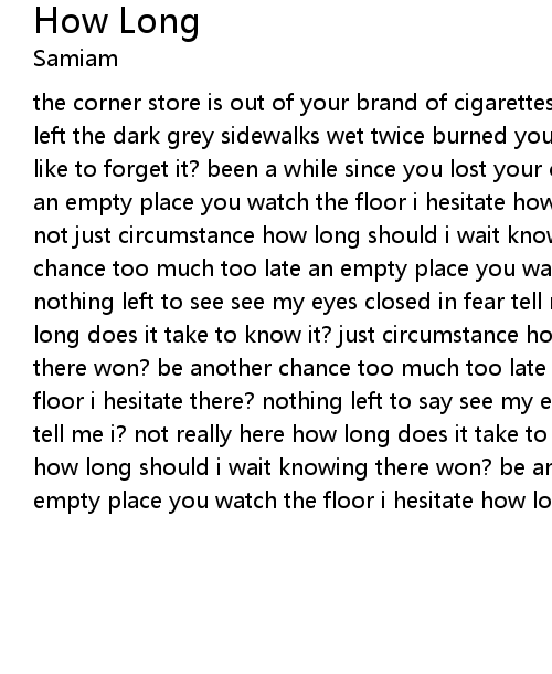 | the corner store is out of your brand of cigarettes the rain has stopped and left the dark grey sidewalks wet twice burned you?e saying things that you would like to forget it? been a while since you lost your confidence a nervous smile an empty place you watch the floor i hesitate how long does it take to know it? not just circumstance how long should i wait knowing there won? be another chance too much too late an empty place you watch the floor i hesitate there? nothing left to see see my eyes closed in fear tell me what i want to her how long does it take to know it? just circumstance how long should i wait knowing there won? be another chance too much too late an empty place you watch the floor i hesitate there? nothing left to say see my eyes shut with fear can you tell me i? not really here how long does it take to know it? just circumstance how long should i wait knowing there won? be another chance too much too late an empty place you watch the floor i hesitate how long |
